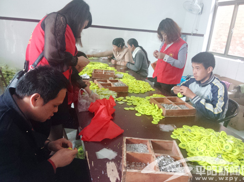 志愿者与残疾人一起做手工活