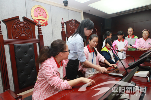 法院公众开放日,法院工作人员向昆阳二中学生说明如何使用法槌