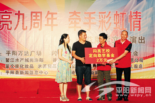 6月22日晚,由平阳万达广场、闪亮艺校、平阳彩虹公益联合会主办的“闪亮九周年,牵手彩虹情”公益助学文艺演出在鳌江万达广场举办。活动现场,一场场精彩的演出吸引了不少市民驻足观看。在现场,闪亮艺校捐款2万元,通过彩虹公益成立专项基金,用来帮助失学的孩子、贫困家庭、贫困大学生等。余婕摄