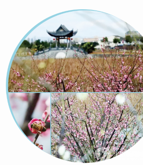 凌寒独自开。这几天,冯宅村荷风梅影滨水公园的800多株梅花开始绽放,暗香浮动,引来不少蜜蜂过来辛勤采蜜。另外,还有200多株梅花种植于村民的房前屋后,粉墙黛瓦间探出的几朵花蕊,非常入画。