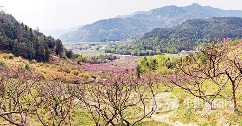 近日,山门镇大岙村的育来水果专业合作社桃园内的100余亩约3000株桃树已进入花期。“满树和娇烂漫红,万枝丹彩灼春融”,粉色的花海覆盖了一大片山坡,在青山绿水间甚是显眼。如“桃花源”般的绚丽景色吸引了许多游客。