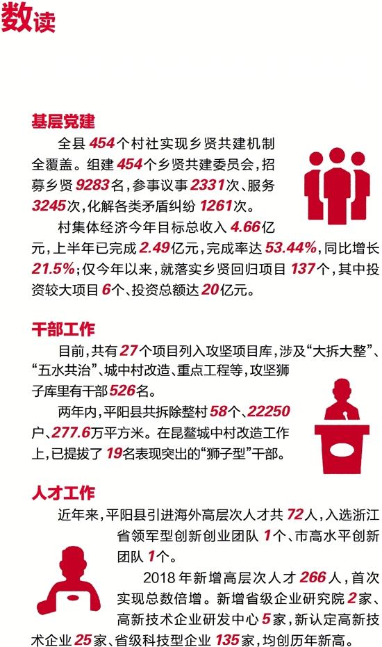 人才工作连续突破,2018年全县新增高层次人才266人……在人才的助力下,2016年~2018年平阳过半主要经济考核指标增速排在温州全市前三,在全省26个加快发展县发展实绩考核中排名跃升至第一档。……数据背后,正是平阳以党建为抓手,推动经济高质量发展的生动写照。在这片希望滋长的热土上,一个个精彩“故事”轮番登场。且让我们将探寻的目光聚集平阳,寻找这座千年古县精彩蜕变背后的成功“密码”。
