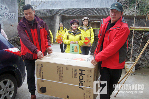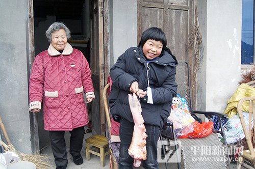 “好多礼物!谢谢阿姨、叔叔!”和奶奶相依为命的萍萍,看到志愿者送来的丰厚礼物,特别是接过那一大袋的零食时,表现得十分开心。她兴奋地提起猪蹄说:“好重啊,奶奶!”女孩欢快的声音让现场的人都露出了笑容。在萍萍家,志愿者还帮她和奶奶,试穿新年衣服,手把手地教她们如何使用新开水壶和新电饭煲,孩子学得很认真。当我们离开时,她拉着奶奶的手一路送到路口,用力地挥手告别。
