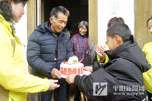 同在维新社区的钦钦,穿上了由志愿者送来的新衣服,还收到了他的心愿礼物——送爷爷一整套衣服、一台取暖器、一个祝寿蛋糕及年货。他的爷爷今年七十大寿,蛋糕上面有红彤彤的寿桃。收到祝福和礼物的爷爷十分高兴。“蛋糕太大了,我们吃不完,大家都分点吃了再走吧。”孩子的爷爷很想多挽留我们一会儿,得知我们行程紧张后,便和钦钦一起追到路边,挥手和我们告别,不舍地说:“慢走,慢走。”