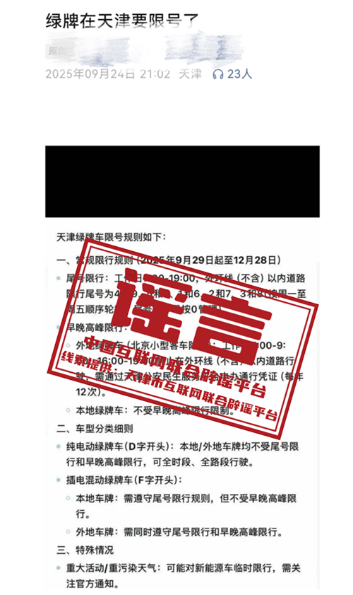 真相:近日,网传“绿牌在天津要限号了”,称天津新能源车辆将实施尾号限行,引发关注。经天津市公安交管部门核实,以上内容系谣言。按照2025年3月21日天津市公安局发布的《关于继续实施机动车限行交通管理措施的通告》,新能源小客车(以车辆登记信息为准)不受机动车尾号及外埠、区域号牌小客车高峰限行措施限制。(来源:“天津辟谣”微信公众号)