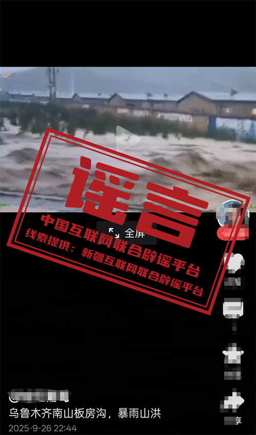 真相:近日,有网民发布涉新疆乌鲁木齐县南山洪水相关视频,配文称“乌鲁木齐南山板房沟,暴雨山洪”,引发关注。经属地相关部门核实,近期乌鲁木齐县域内未发生洪水,该网传信息不实。(来源:“新疆网络辟谣”微信公众号)