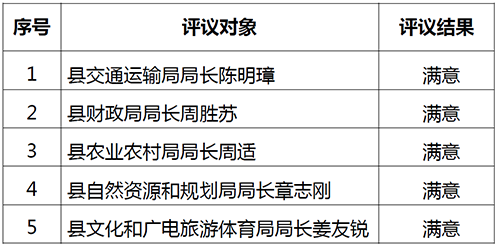 2025年12月15日平阳县第十七届人民代表大会常务委员会第三十次会议对县人民政府5个组成部门主要负责人履职情况进行了评议。现将评议结果公告如下: