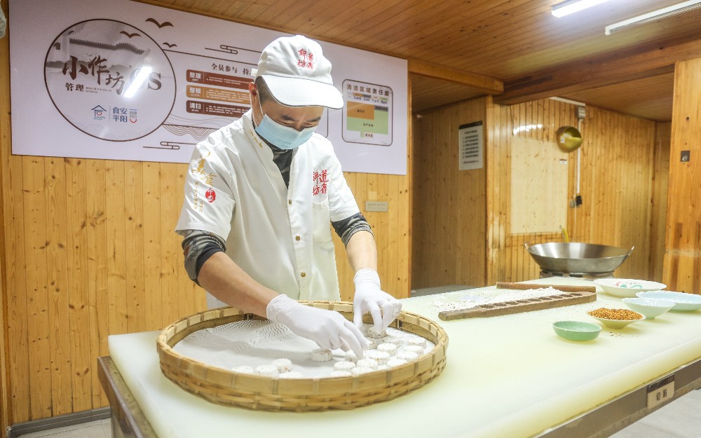 腾蛟镇道鑫饼坊内,每日清晨糕点飘香。师傅专注制作传统桂花糕,以优质大米粉和天然海藻糖按古法调配,经铺粉、填馅、敲打、蒸制等多道工序制成。