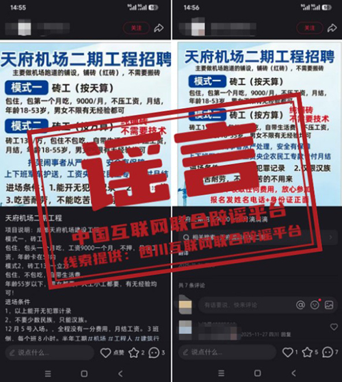 真相:近期,网传“成都天府机场二期工程正在招工”,引发关注。1月15日,成都东部新区公园城市建设局与成都天府国际机场二期扩建工程前期工作办公室联合发布《关于天府国际机场二期工程相关信息的公告》指出:以上招工信息均为虚假内容,请广大群众切勿轻信。(来源:四川互联网举报辟谣平台)