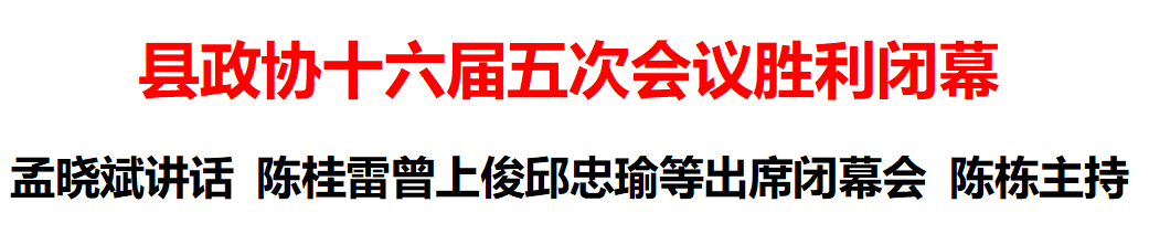 县委书记孟晓斌对会议的圆满成功表示祝贺。他说,会议期间,全体政协委员怀着强烈的政治责任感和使命感,认真审议各项报告,积极建言献策,圆满完成工作任务,充分展现了广大政协委员心系发展的责任担当、体现了政治协商的独特优势、彰显了全过程人民民主的生动实践。大会开得务实高效、凝心聚力,是一次统一思想、共谋发展的大会,是一次团结鼓劲、续写新篇的大会。