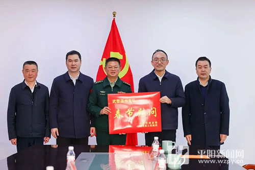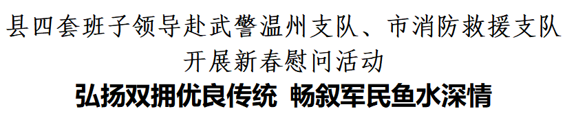 本网讯(记者 张蔚旻/文 陈云散/摄 编辑 郑振国)2月10日,孟晓斌、陈桂雷、曾上俊、陈栋等县四套班子领导率县拥军慰问团,前往武警温州支队、市消防救援支队开展新春慰问活动,向广大武警官兵和消防指战员致以崇高的敬意和亲切的问候,并与相关负责人开展座谈交流,共叙鱼水深情、共话融合发展。