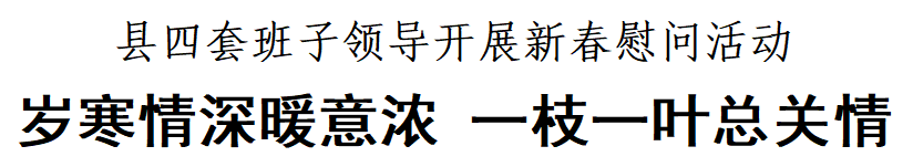 本网讯(记者 徐远虑 张蔚旻 曹文倩 李梦 张炜/文 陈云散 鲍思冲 林鑫 等/摄 编辑 施克聪)新春佳节将至,岁寒情暖意浓。连日来,孟晓斌、陈桂雷、曾上俊、陈栋、邱忠瑜等县四套班子领导,分赴全县各地,看望慰问老干部、建国前老党员、困难党员和群众、新业态领域困难职员及退役军人代表,向他们致以诚挚的节日问候,送去新春的美好祝福。