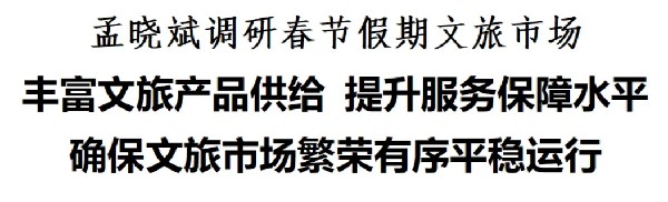 调研中,孟晓斌强调,要持续丰富文旅产品供给,坚持以文塑旅、以旅彰文,深入挖掘和整合我县特色文旅资源,不断创新形式载体,引育一批优质业态,打造一批优质文旅产品,满足游客多元化、个性化需求。要着力提升服务保障水平,不断优化消费体验,围绕“吃住行游购娱”全链条,加强精细化管理和人性化服务,让“流量”变“留量”。要牢牢守住安全底线,聚焦重点领域和关键环节,持续深入开展风险隐患排查整治,抓好重点时段、重点路段交通秩序管理,抓好景点景区内外安全防范与秩序维护工作,全力营造放心、安心、舒心的旅游环境,让广大游客乘兴而来、满意而归。