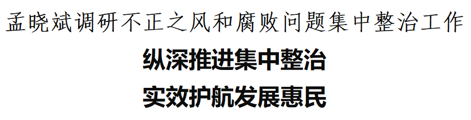 孟晓斌强调,要系统施治,以更务实举措打好攻坚决战。要牢牢把握整治重点,聚焦群众诉求办好民生实事,聚焦项目实事狠抓落地见效,聚焦巩固提升严防问题反弹;要集中攻坚案件查办,紧盯关键深挖突出问题,严查严惩形成有力震慑,联动推进凝聚办案合力;要全力推动标本兼治,深化以案促改补齐监管漏洞,推动建章立制规范治理体系,提升监督效能夯实长效治理。