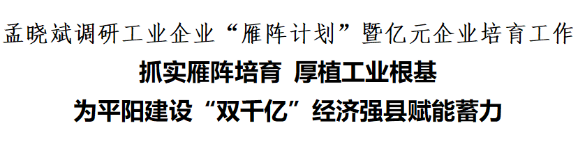 调研中,孟晓斌指出,工业是平阳经济发展的“压舱石”,“雁阵计划”是推动工业转型升级的重要抓手。当前,平阳正处于加快打造全省工业大县的关键阶段,深入实施“雁阵计划”、加快企业梯度培育,对构建现代化产业体系、实现高质量发展具有重要意义。要聚焦“传统产业强基、新兴产业领跑、未来产业突破”目标,持续优化企业培育体系,推动形成“头雁领航、鸿雁高飞、强雁成长”的良好发展格局。