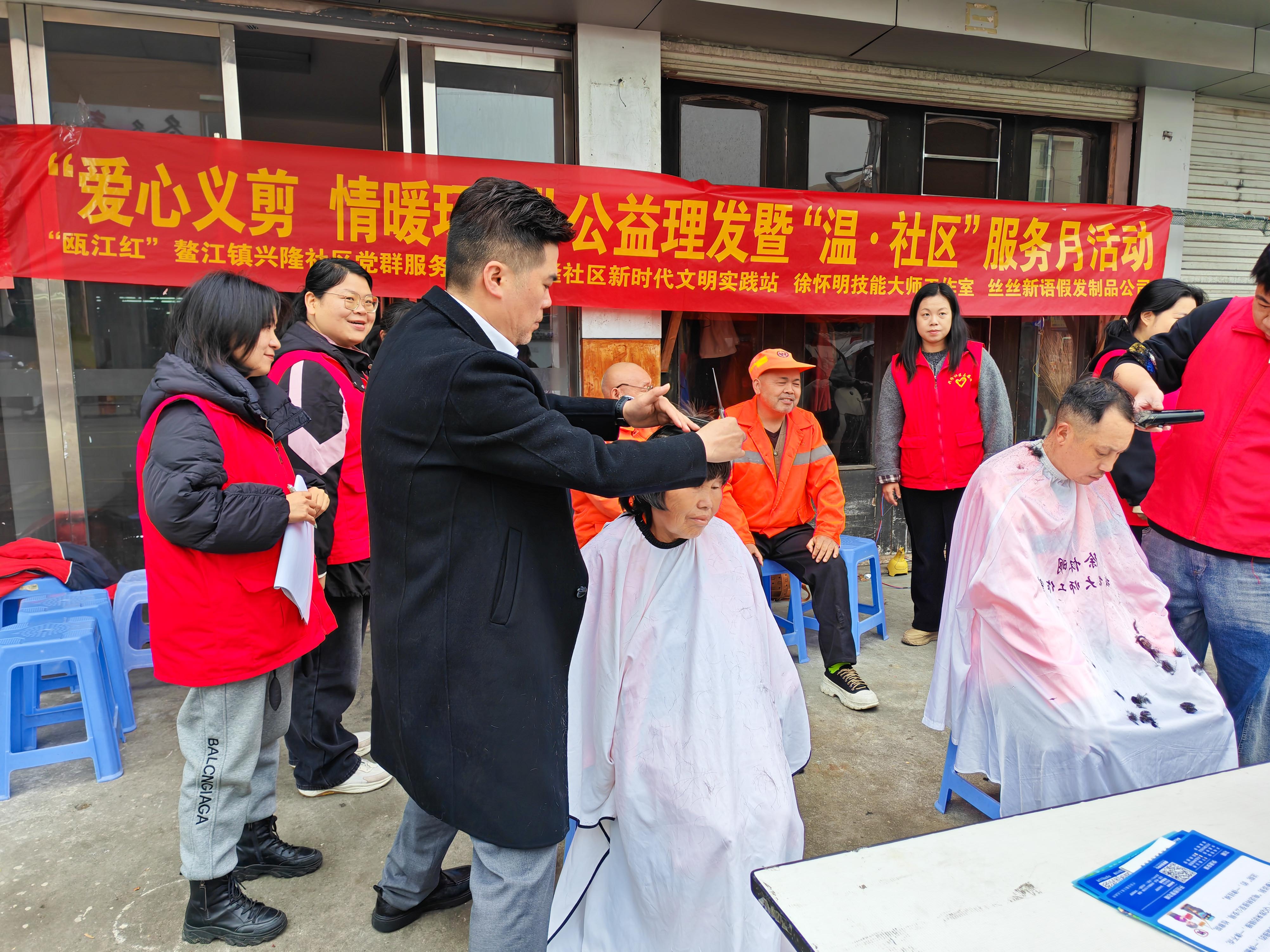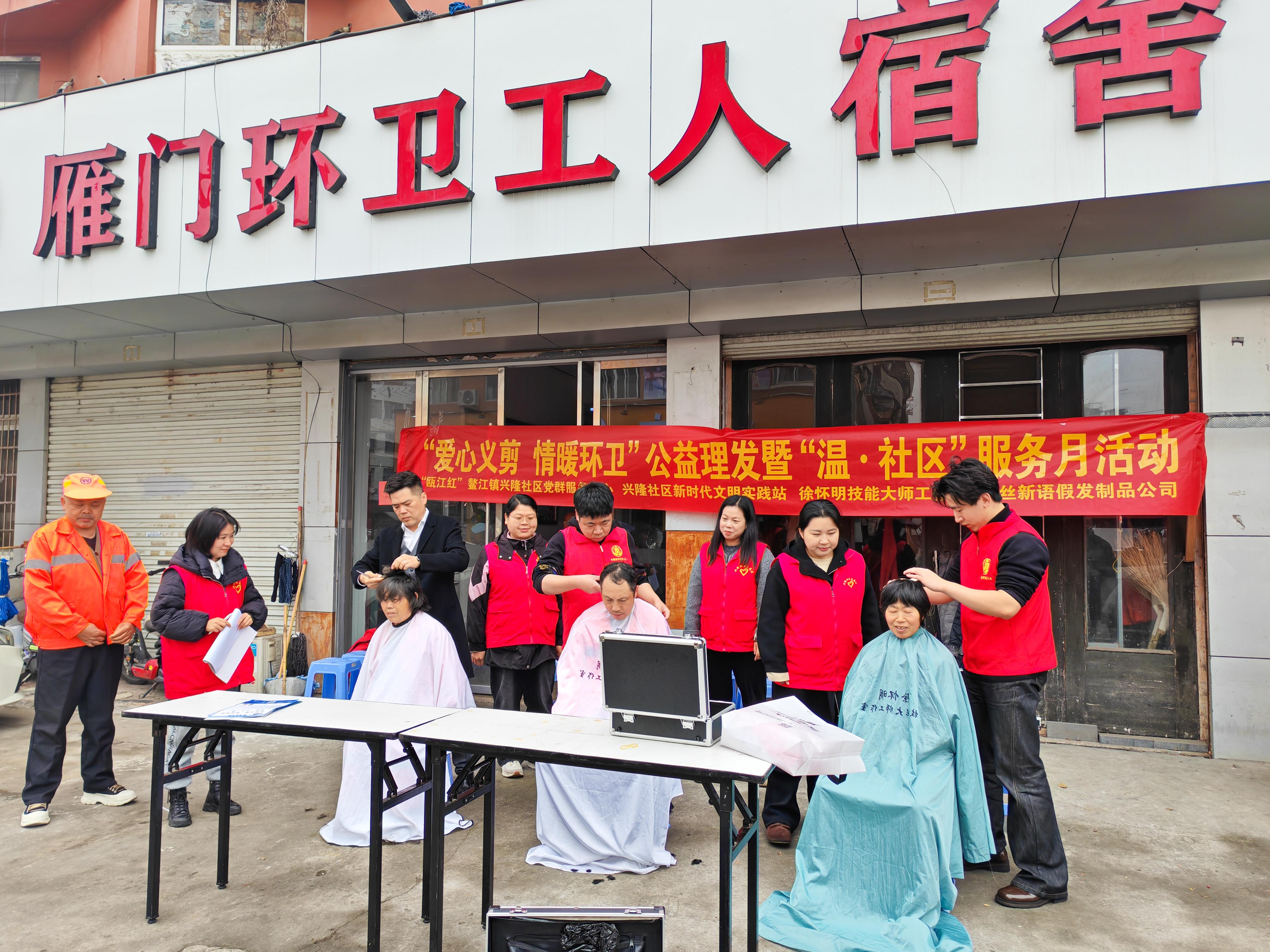 近日,“瓯江红”鳌江镇兴隆社区党群服务中心等多方联合开展“爱心义剪 情暖环卫”公益活动,向一线环卫工人送上关怀。