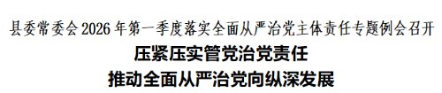 会议传达学习了上级关于全面从严治党主体责任检查相关文件精神;有关县领导汇报了2025年履行“一岗双责”情况,并对分管部门和联系单位的党风廉政风险进行分析防范;听取了乡镇、县机关单位“一把手”述责述廉、群众身边不正之风和腐败问题集中整治督导反馈问题整改及重点项目进展情况。