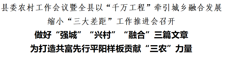 本网讯(记者 张炜/文 鲍思冲/摄 编辑 周启来)4月3日,县委农村工作会议暨全县以“千万工程”牵引城乡融合发展缩小“三大差距”工作推进会召开。县委书记孟晓斌在会上强调,要深入学习贯彻习近平总书记关于“三农”工作的重要论述和重要指示精神,全面落实中央和省委、市委农村工作会议部署要求,深化以“千万工程”牵引城乡融合发展、缩小“三大差距”,以富民为核心,做深做好“强城”“兴村”“融合”三篇文章,全力推动“十五五”农业农村现代化开好局、起好步,为加快提升发展、打造共富先行平阳样板提供有力支撑。