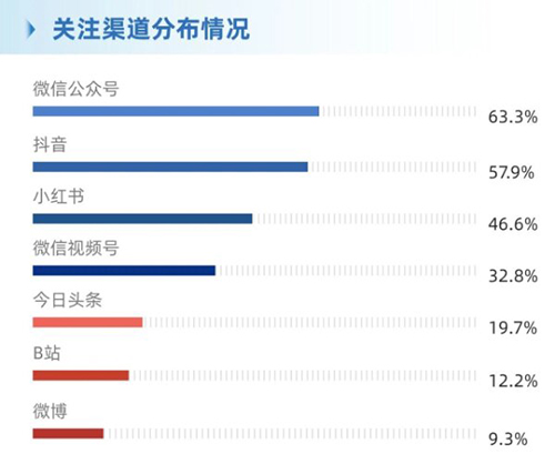 整体占比:微信公众号(63.3%)、抖音(57.9%)占据主导,小红书、微信视频号、今日头条次之,B站(12.2%)、微博(9.3%)占比较低。