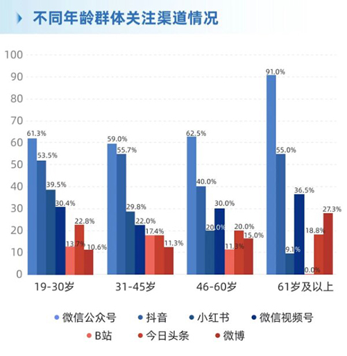 19-30岁:以微信公众号(61.3%)和抖音(53.5%)为主,小红书、微信视频号分别为39.5%、30.4%;