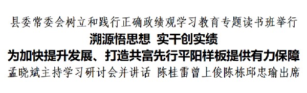孟晓斌强调,要做好“四篇文章”,以更实举措推动学习教育见行见效。要突出“溯”字,结合平阳从“欠发达县”到“提升发展”的生动实践,从中更加深刻地领悟正确政绩观的真理伟力、实践伟力和时代伟力,在赓续传承中坚定方向;要突出“学”字,结合总书记关于高质量发展的系列重要指示、关于干部作风能力的重要要求,做到融会贯通,在理论武装中凝心铸魂;要突出“践”字,引导广大干部在改革发展主战场、矛盾化解第一线、服务群众最前沿,锤炼作风、增长才干、创造实绩,在以学促干中彰显担当;要突出“树”字,结合“三比三看”“三争三强”等活动,深入挖掘和宣传一批先进典型,在实干实绩中树牢导向。